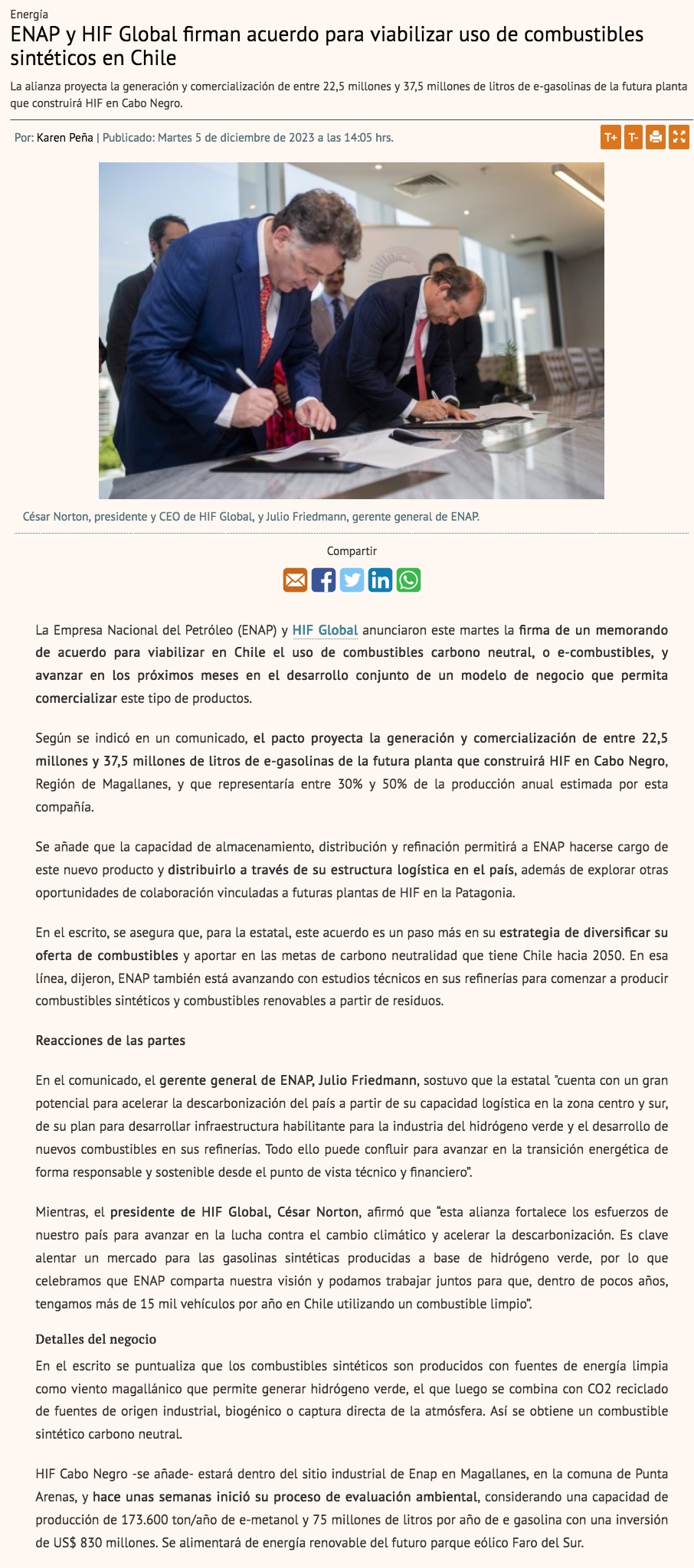 Enap acuerda con HIF distribuir combustibles sintéticos en el país producidos con hidrógeno verde - (El Mercurio de Santiago)