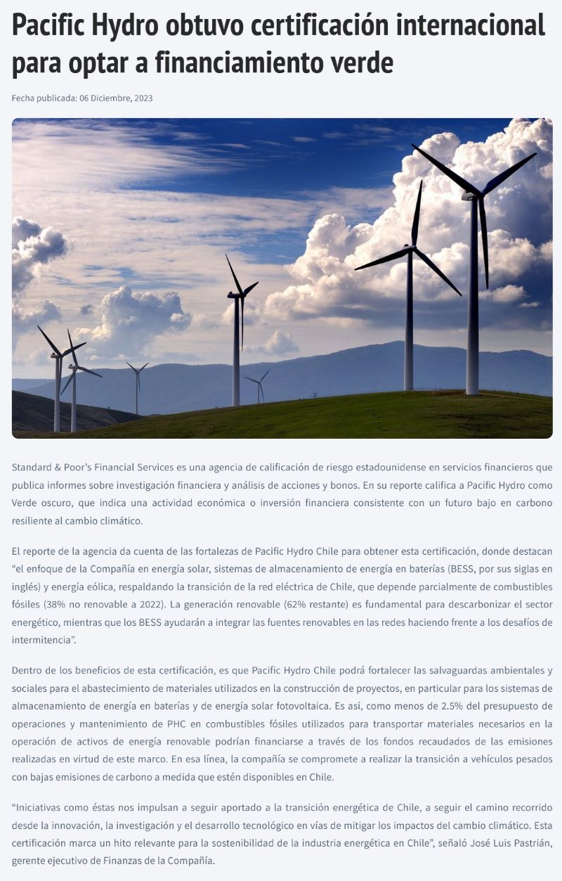 Pacific Hydro obtiene certificación internacional para acceder a financiamiento verde en sus proyectos - (revistaei.cl)