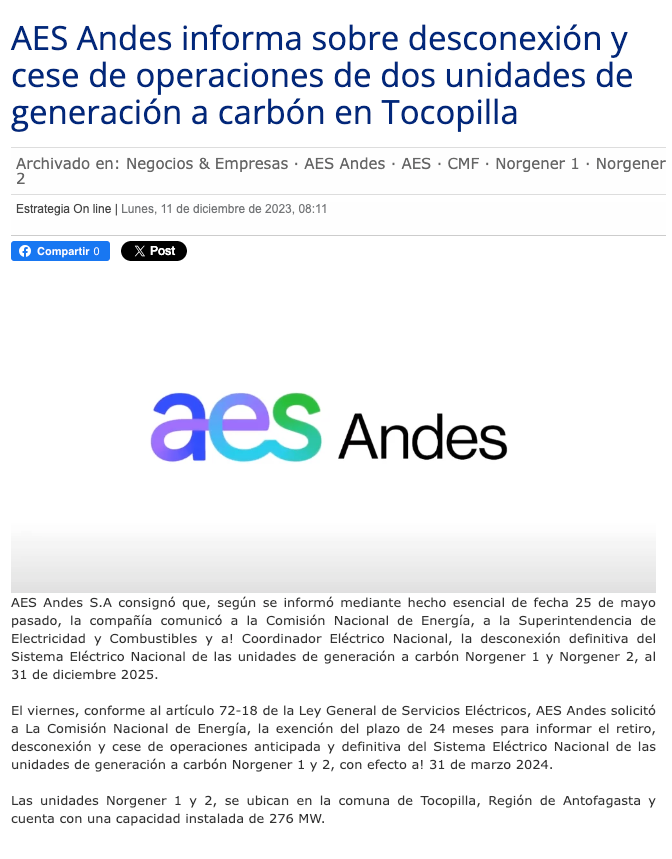 AES Andes pide adelantar el retiro definitivo de la central Norgener para 2024 - (terram.cl)
