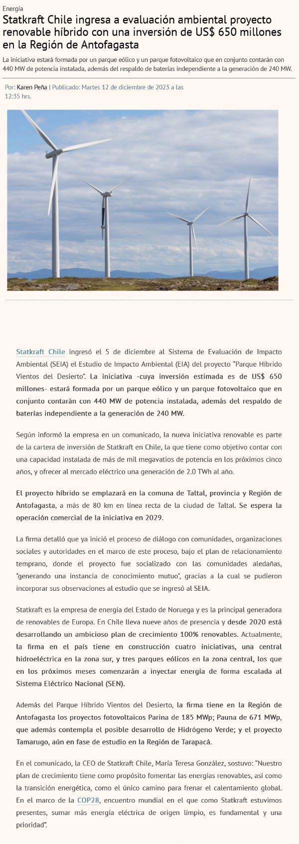 Statkraft inicia tramitación de proyecto híbrido con inversión de US$ 650 millones - (El Mercurio de Santiago)