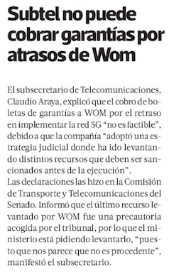 Subtel asegura que aún “no es factible” ejecutar el cobro de pólizas de seguro a WOM - (El Mercurio de Santiago)