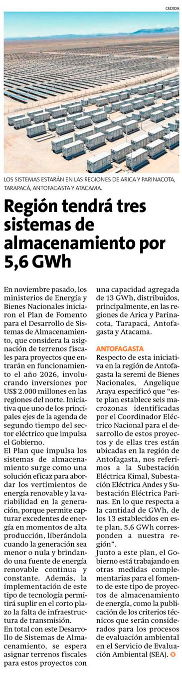 Región tendrá tres sistemas de almacenamiento por 5,6 GWh - (El Mercurio de Antofagasta)