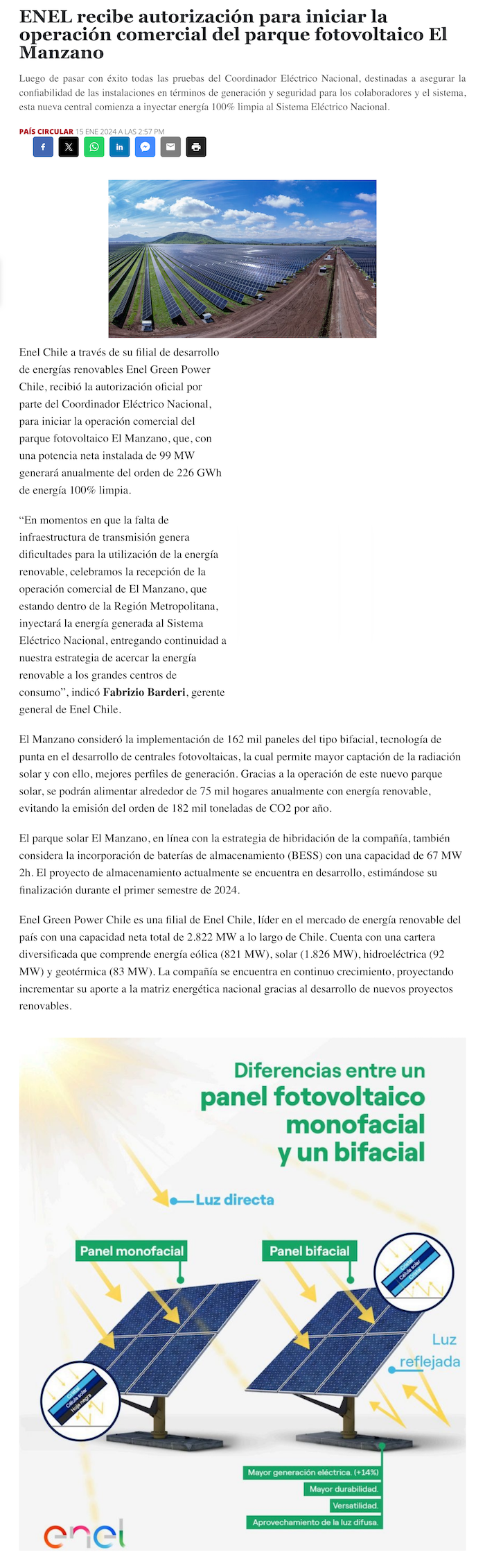 Enel recibe autorización para iniciar la operación comercial del Parque Fotovoltaico El Manzano - (eldinamo)