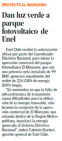 ENEL recibe autorización para iniciar la operación comercial del parque fotovoltaico El Manzano - (paiscircular.cl)