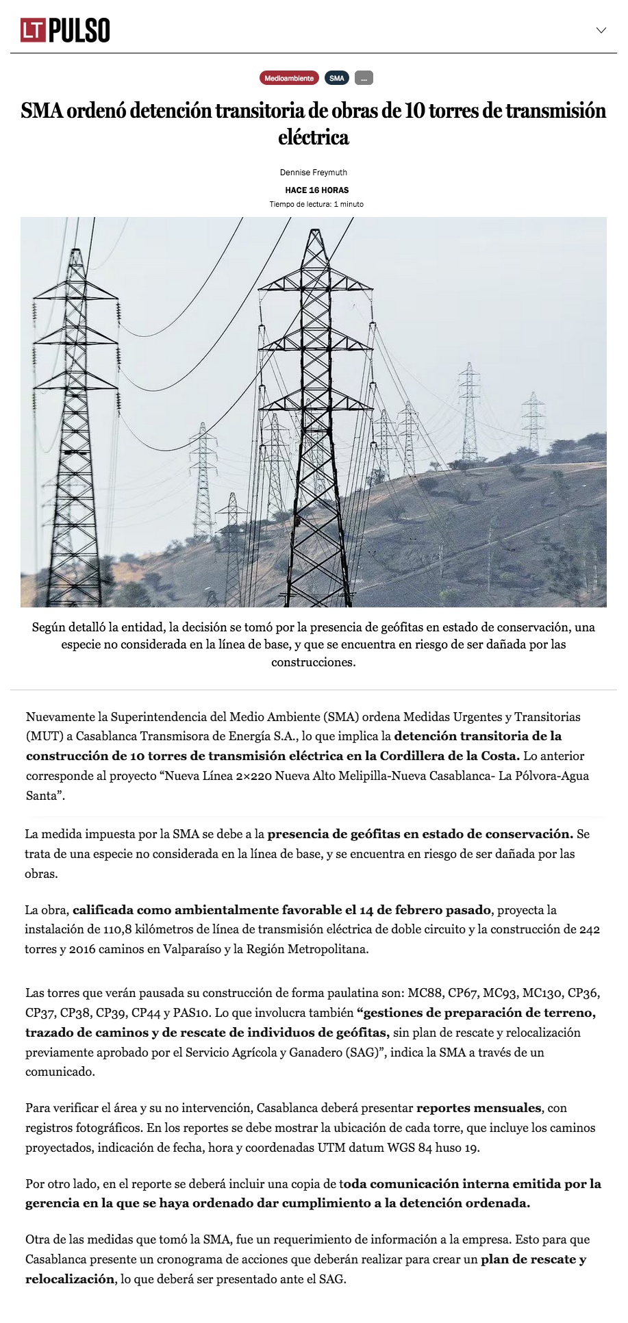SMA resuelve detener la instalación de diez torres de alta tensión - (El Mercurio de Valparaíso)