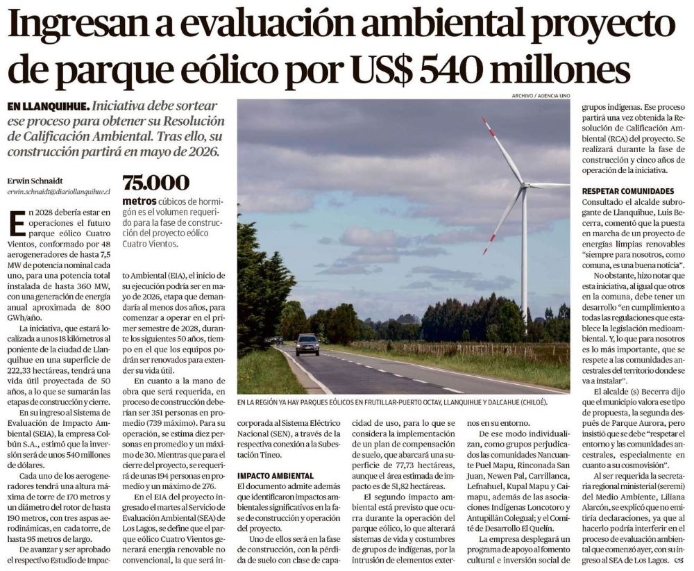 Ingresan a evaluación ambiental proyecto de parque eólico por US$540 millones - (El Austral de Osorno)