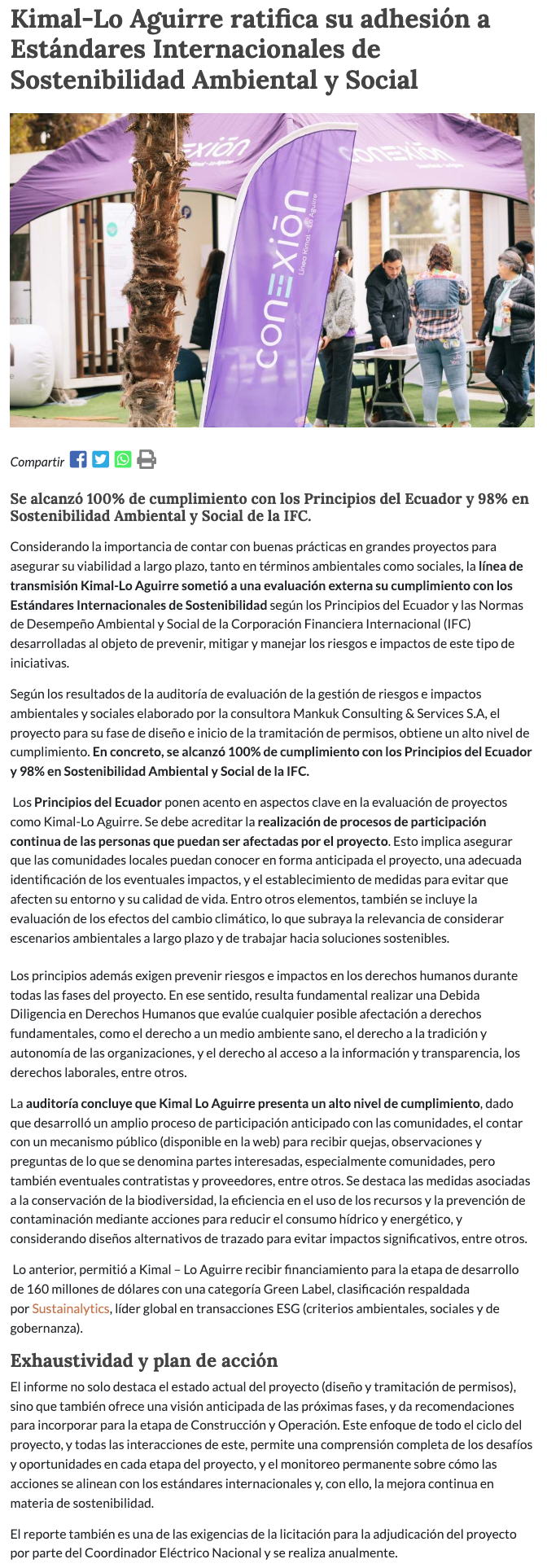 Kimal-Lo Aguirre ratifica su adhesión a Estándares Internacionales de Sostenibilidad Ambiental y Social - (Estrategia Online)