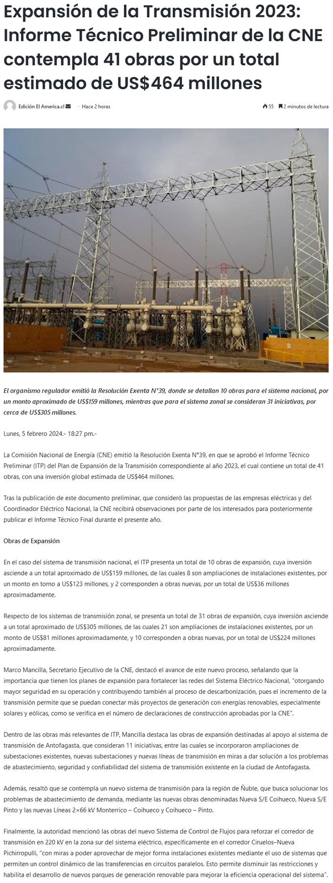 CNE propone obras por US$ 464 millones para expandir transmisión eléctrica - (Diario Financiero)