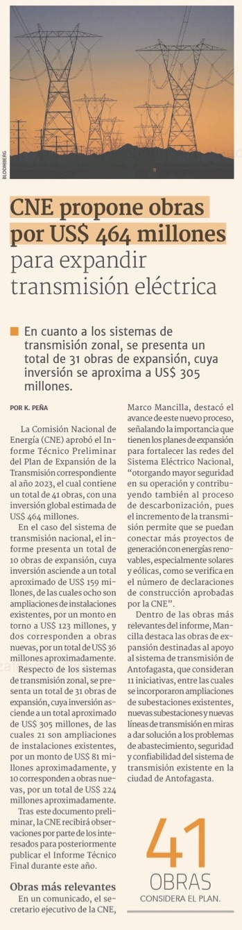 Expansión de la Transmisión 2023: Informe Técnico Preliminar de la CNE contempla 41 obras por un total estimado de US$464 millones - (elamerica)