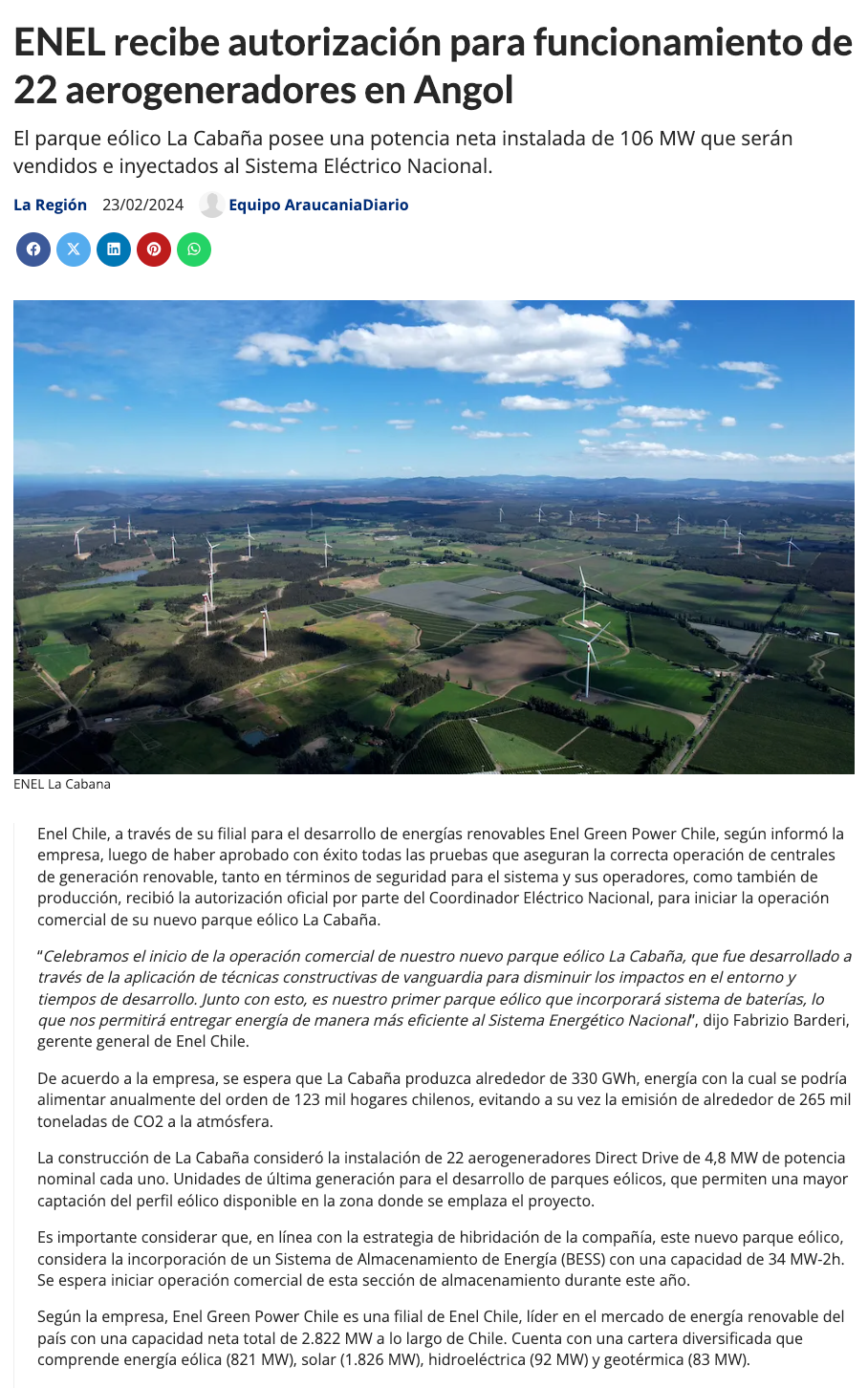 Enel Chile recibe autorización para iniciar operación comercial de nuevo parque eólico - (araucanianoticias.cl)