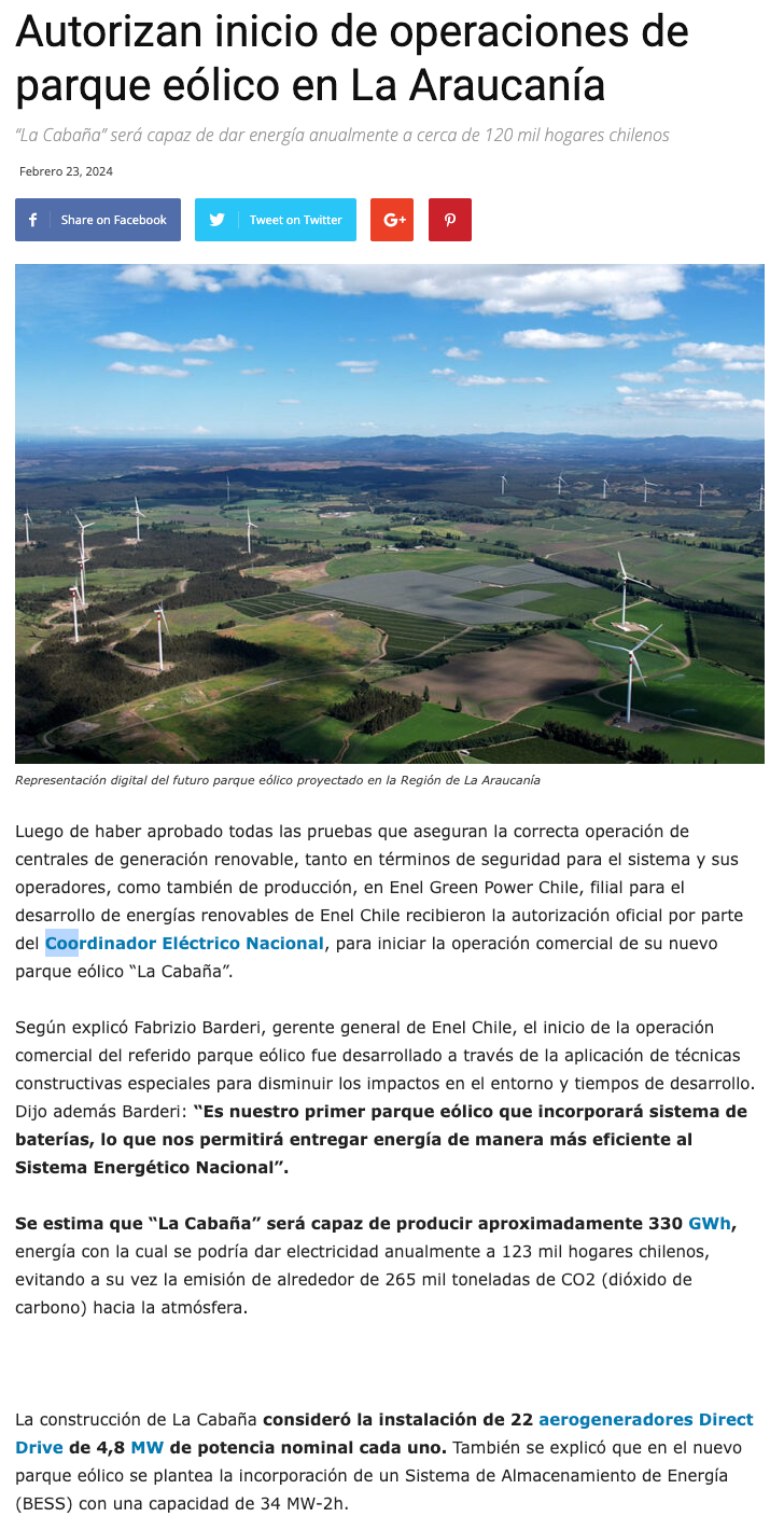 Enel Chile recibe autorización para iniciar operación comercial de nuevo parque eólico - (araucanianoticias.cl)