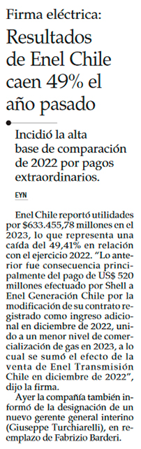 Enel Chile reduce casi a la mitad sus ganancias y sus ingresos caen 11% en 2023 - (Pulso)