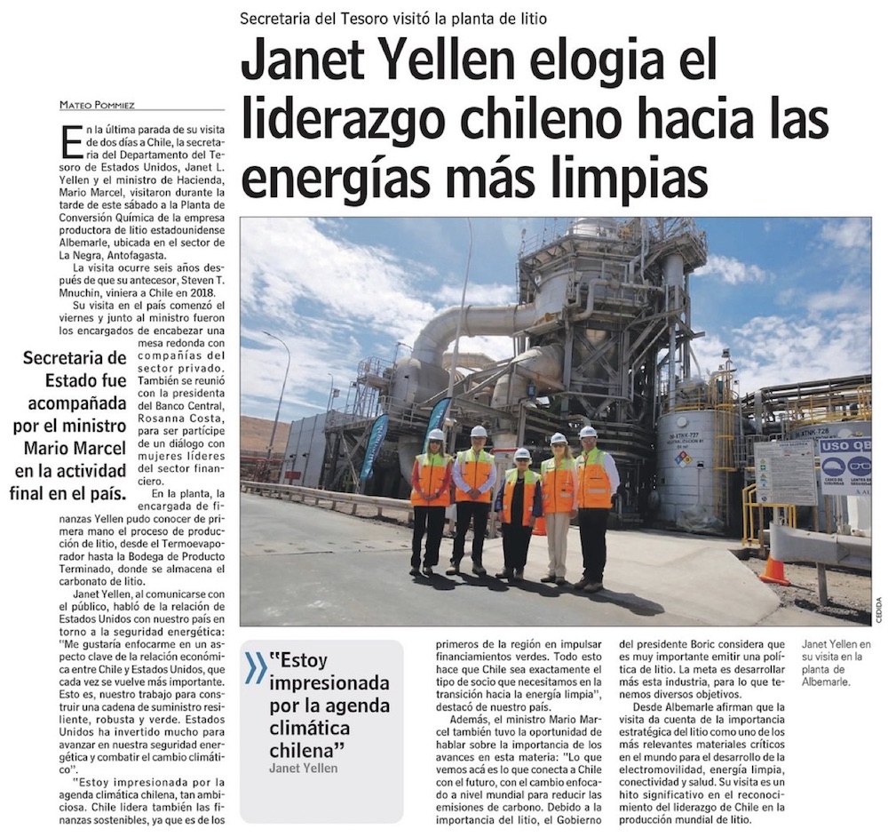 Yellen remarca a Chile como socio “estratégico” en energías limpias - (El Mercurio de Santiago)
