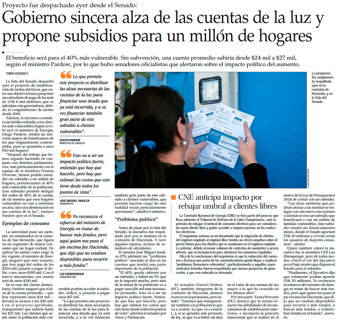 Senado da luz verde a proyecto de estabilización de tarifas eléctricas y pasa a la Cámara de Diputados - (Diario Financiero)