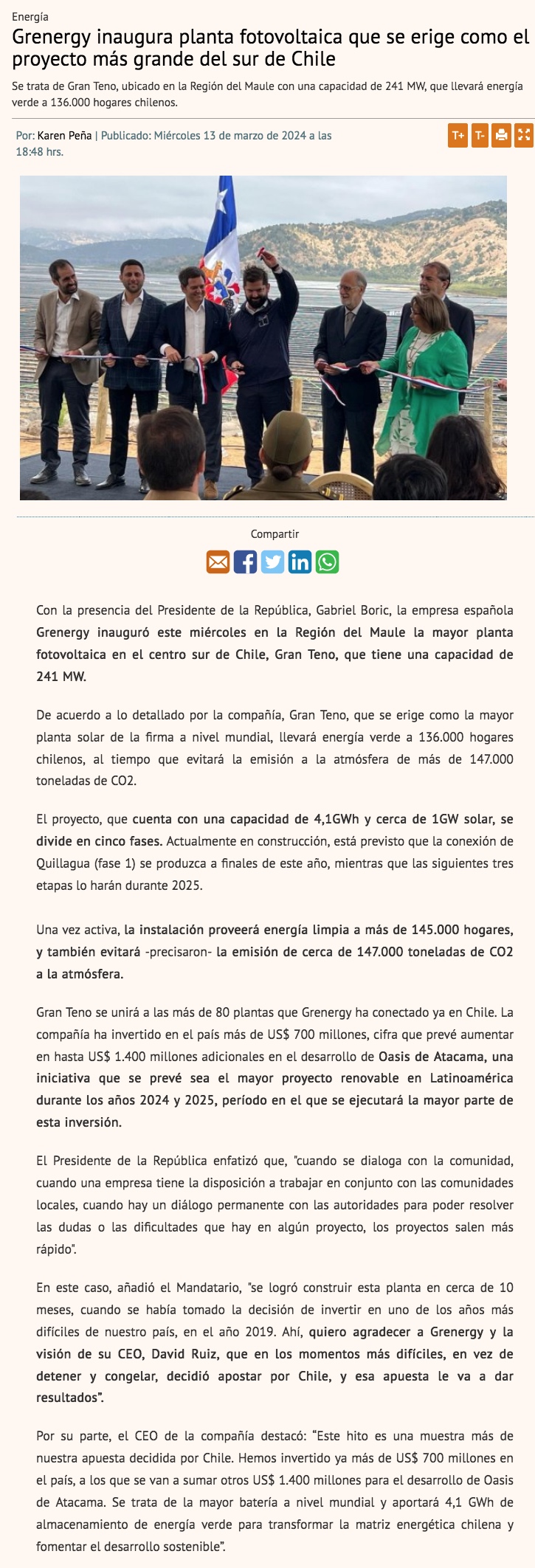 Inauguran mayor planta solar de Sudamérica ubicada en la Región del Maule - (Pulso)