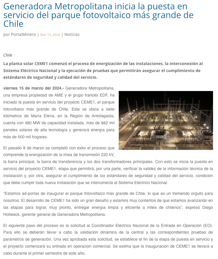 Generadora Metropolitana inicia puesta en servicio de planta solar que involucra una inversión de US$ 280 millones - (DF Online)