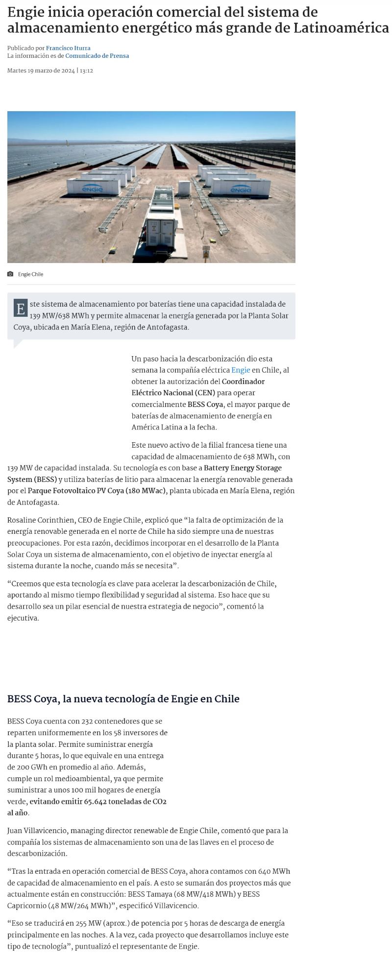 Engie Chile inicia operación comercial de proyecto BESS más grande de América Latina - (revistaei.cl)