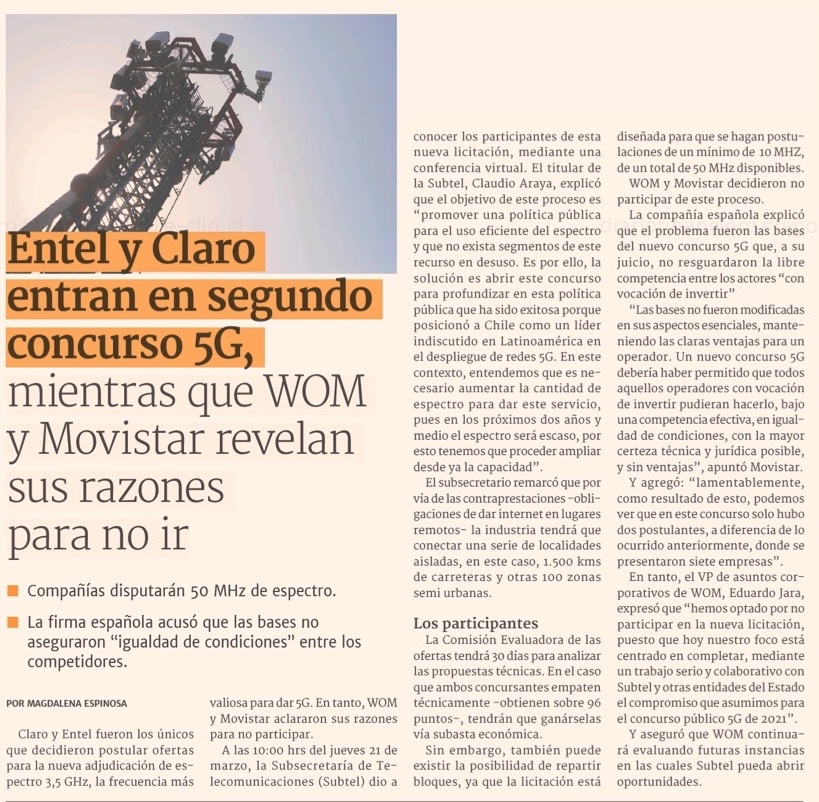 Claro y Entel presentan oferta en segundo concurso público de 5G mientras Wom y Movistar se restan del proceso - (Pulso)