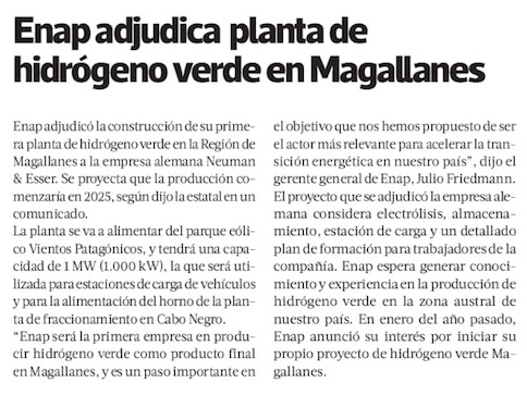 Enap adjudica construcción de planta de hidrógeno verde en Magallanes - (El Mercurio de Santiago)