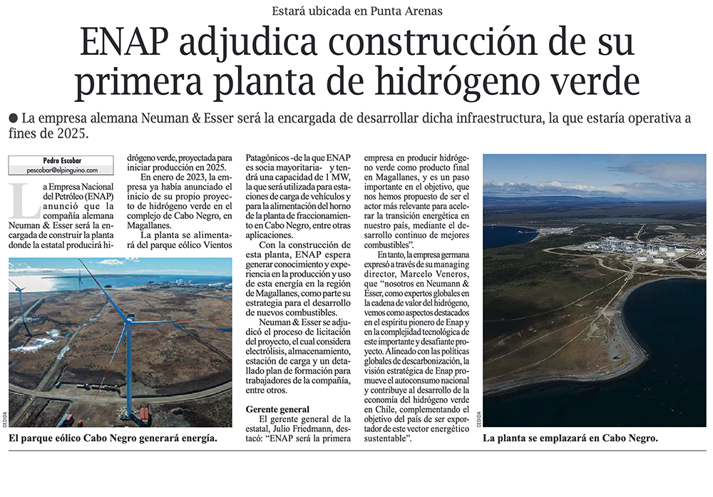 ENAP adjudica la construcción de su primera planta de hidrógeno verde - (La Tercera Online)