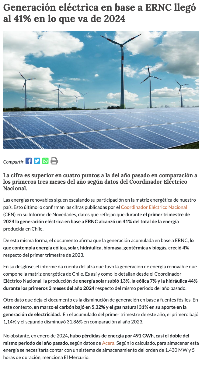 Récord: generación eléctrica en base a ERNC llegó al 41% en primer trimestre de 2024 - (induambiente.cl)