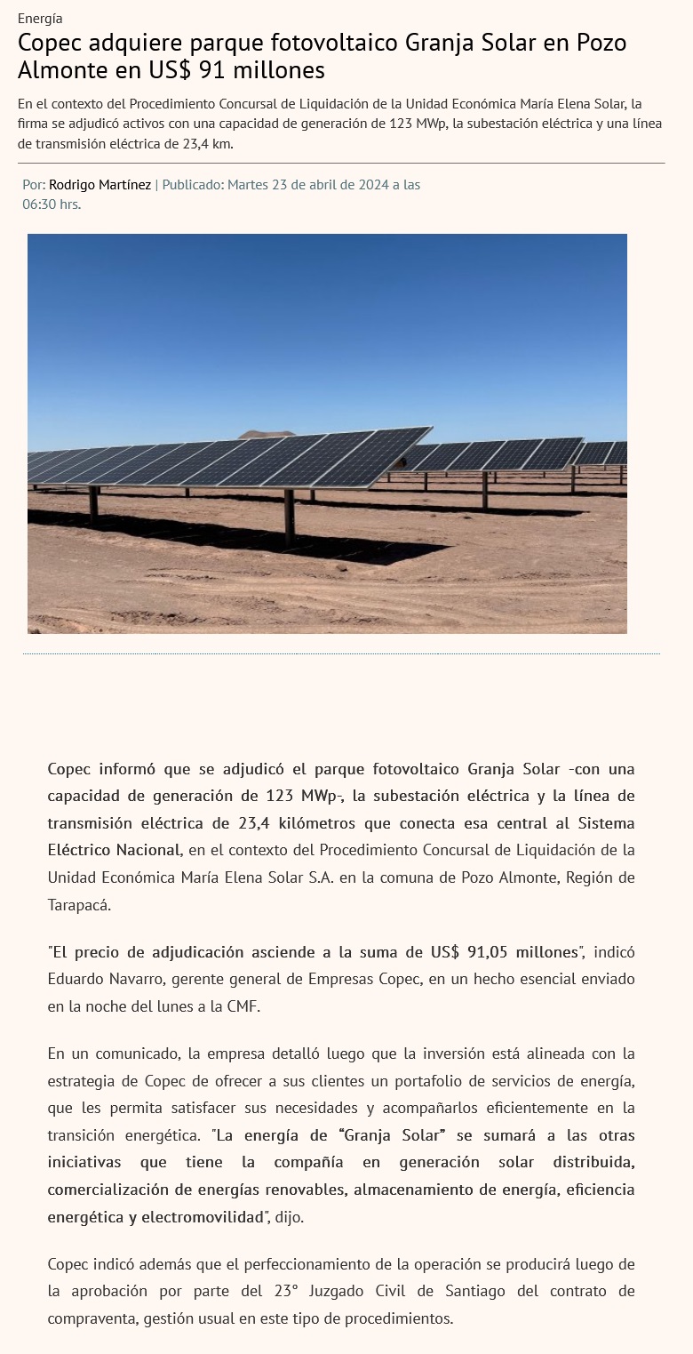 Copec aterriza en la generación ERNC y activa ambiciosa diversificación - (La Segunda)