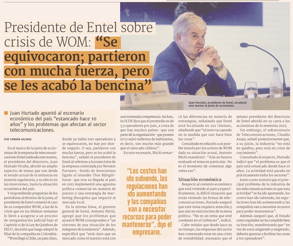 Juan Hurtado, socio de Entel, y crisis de WOM: "Llegaron bajando los precios, pero se les acabó la bencina" - (Pulso)