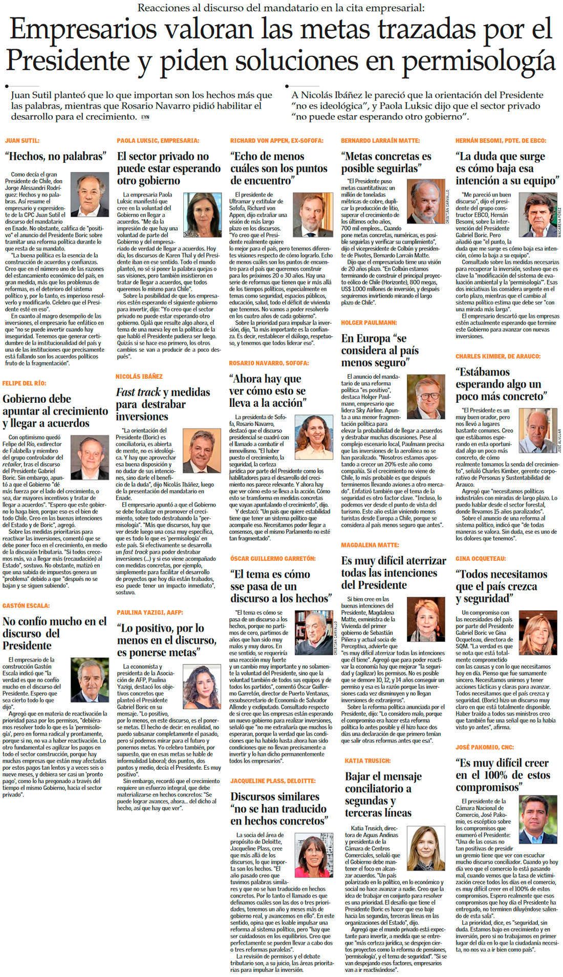 Empresariado destaca anuncio de reforma al sistema político y sitúa el crecimiento como meta central - (Diario Financiero)