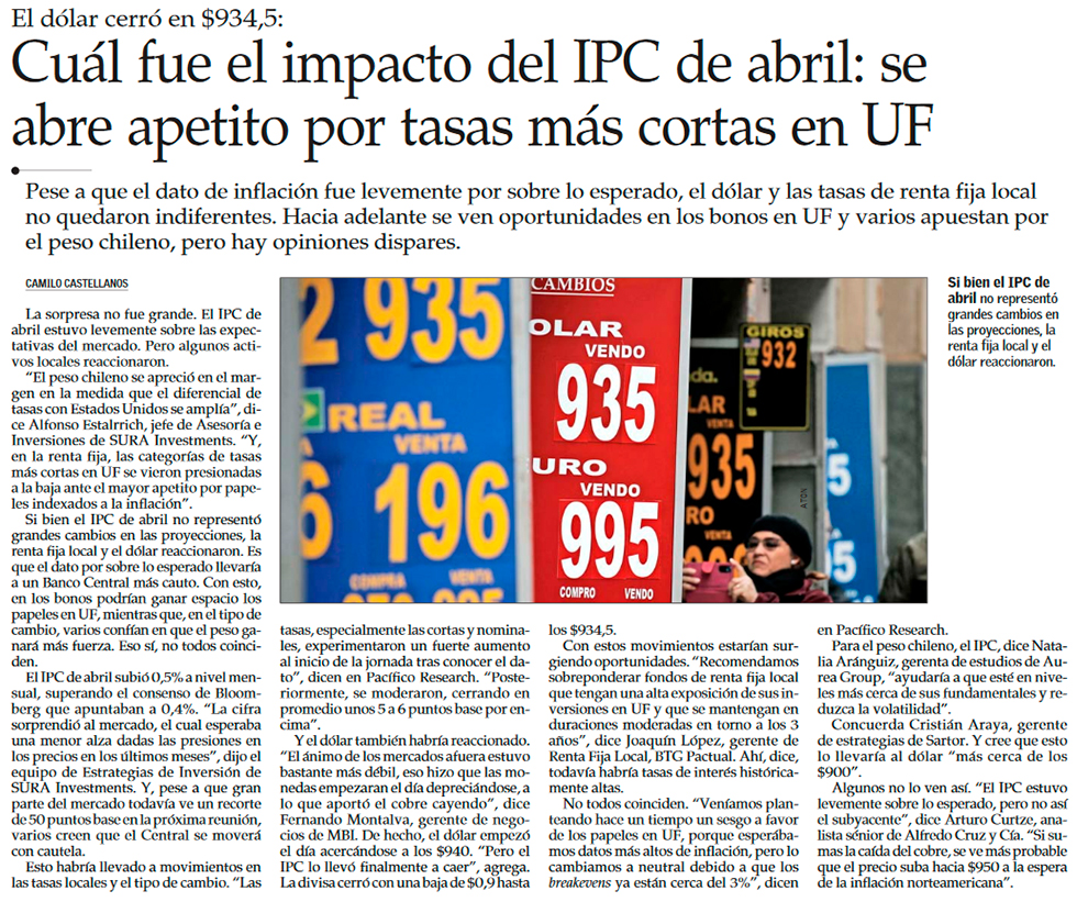 Tras IPC de abril, se afianza en el mercado pronóstico de inflación cerca de 4% a diciembre y de una próxima baja de tasas de 50 puntos - (Diario Financiero)