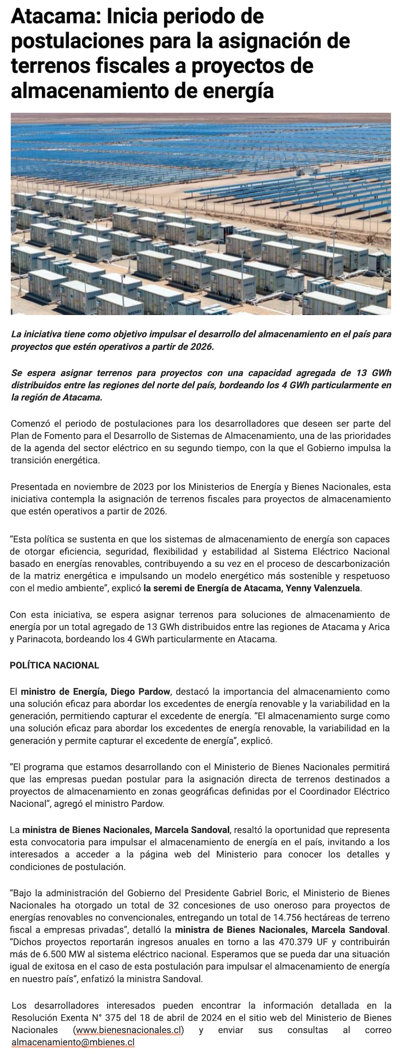 Atacama: Inicia periodo de postulaciones de terrenos fiscales a proyectos de almacenamiento de energía - (elzorronortino.cl)