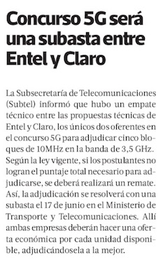 Tras empate técnico, Entel y Claro definirán nueva licitación 5g mediante subasta - (El Mercurio de Santiago)