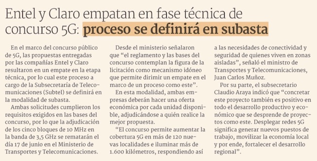 Tras empate técnico, Entel y Claro definirán nueva licitación 5g mediante subasta - (El Mercurio de Santiago)