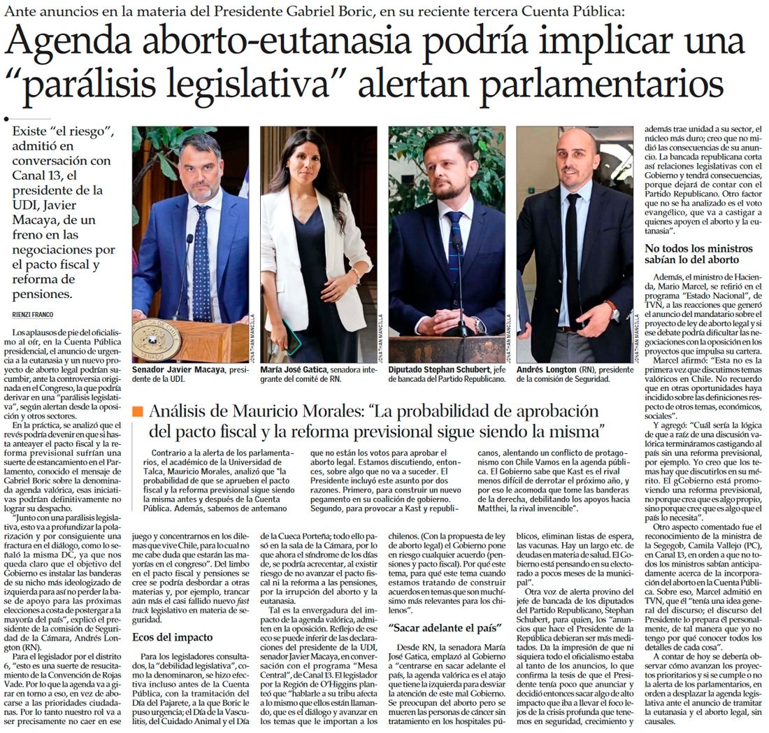 Aborto legal y eutanasia: los anuncios que marcaron la Cuenta Pública - (El Mercurio de Antofagasta)