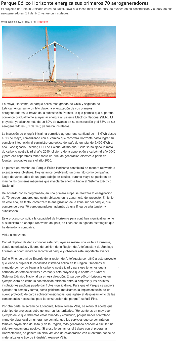 Proyecto Parque Eólico Horizonte alcanza hito clave con la energización de sus primeros aerogeneradores - (norteyenegia.cl)