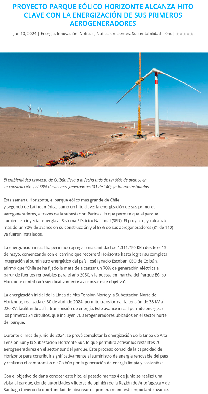 Parque Eólico Horizonte energiza sus primeros 70 aerogeneradores - (soyantofagasta)