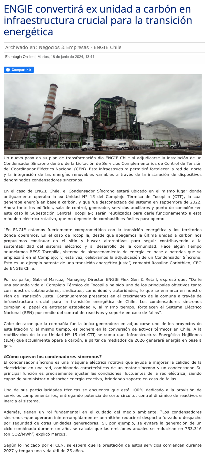 Engie convertirá ex unidad 15 a carbón en infraestructura clave - (El Mercurio de Antofagasta)