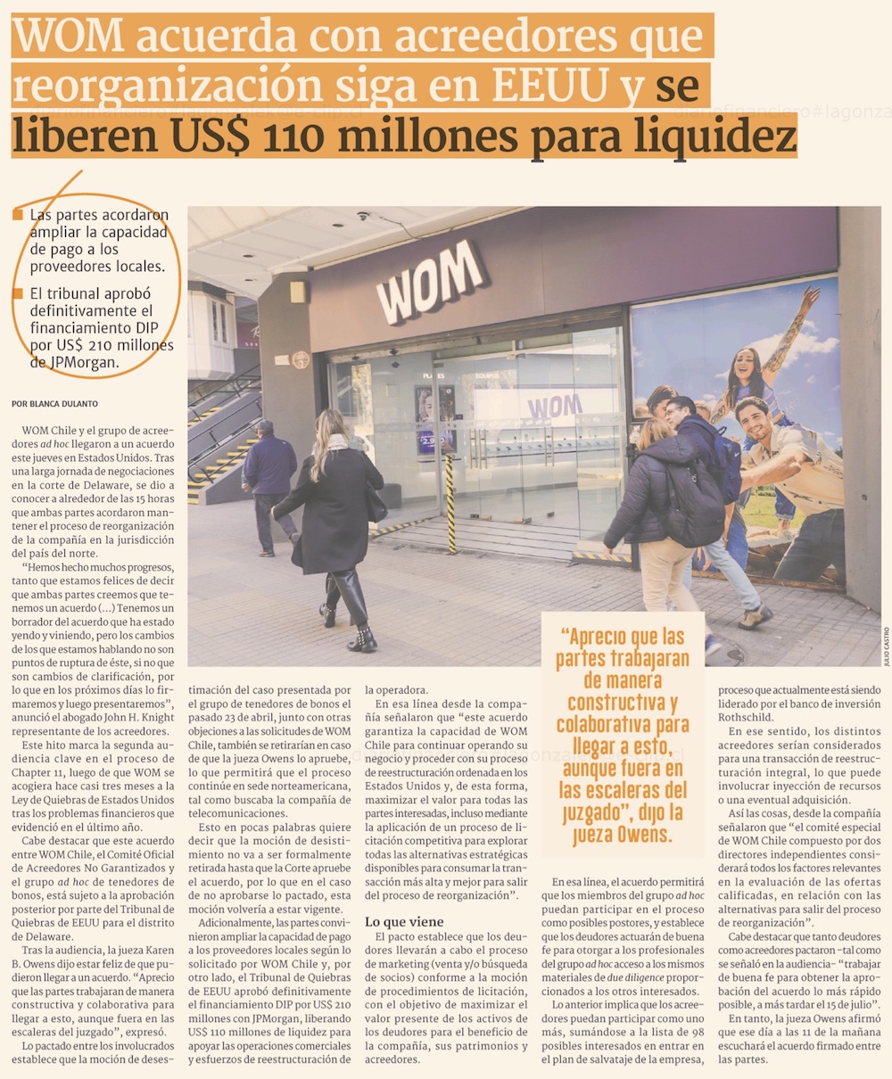WOM acuerda con acreedores continuar reorganización en EE.UU. - (El Mercurio de Santiago)