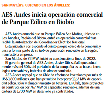AES Andes inicia operación comercial de San Matías y consolida su generación eólica en Biobío - (DF Online)