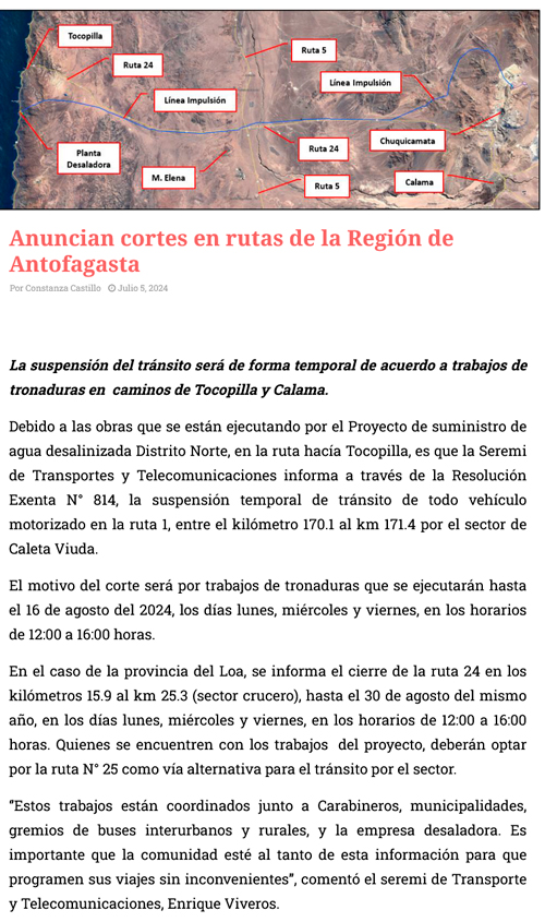 Anuncian cortes temporales en rutas de Tocopilla y Calama por trabajos de tronadura - (soyantofagasta)
