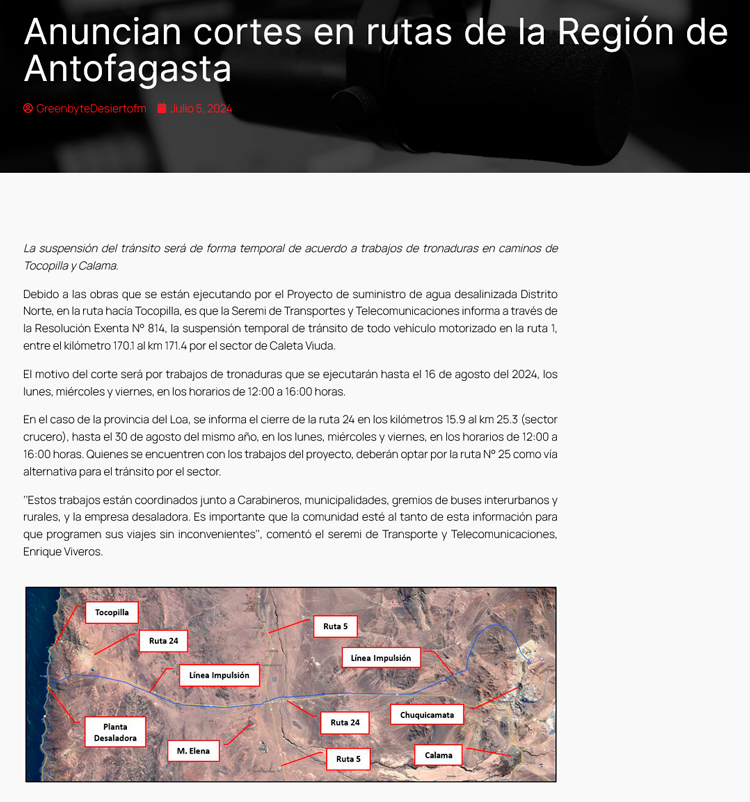 Anuncian cortes temporales en rutas de Tocopilla y Calama por trabajos de tronadura - (soyantofagasta)