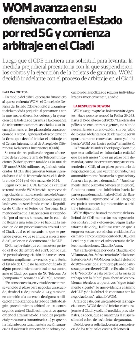 WOM avanza en su ofensiva contra el Estado por red 5G e inicia arbitraje en el CIADI - (La Tercera Online)