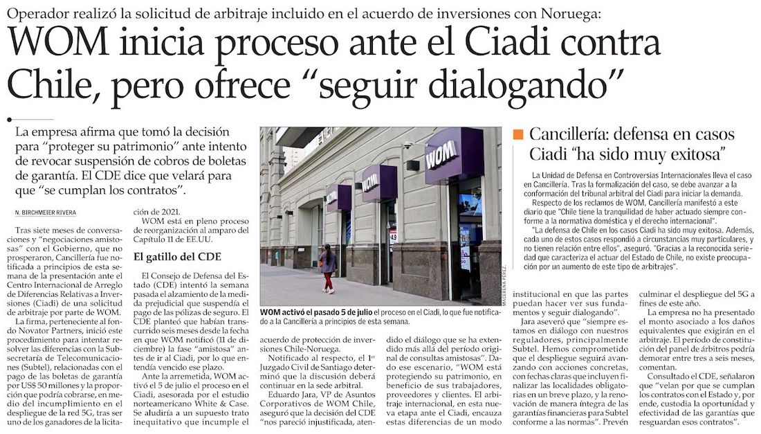 WOM avanza en su ofensiva contra el Estado por red 5G e inicia arbitraje en el CIADI - (La Tercera Online)