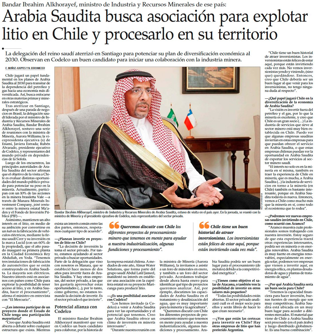Ministro de Minería de Arabia Saudita: “Chile tiene minerales que queremos y no tenemos, como litio y cobre” - (Diario Financiero)