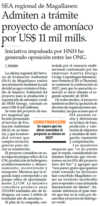SEA admite a trámite megaproyecto de amoniaco verde en Magallanes - (La Segunda)