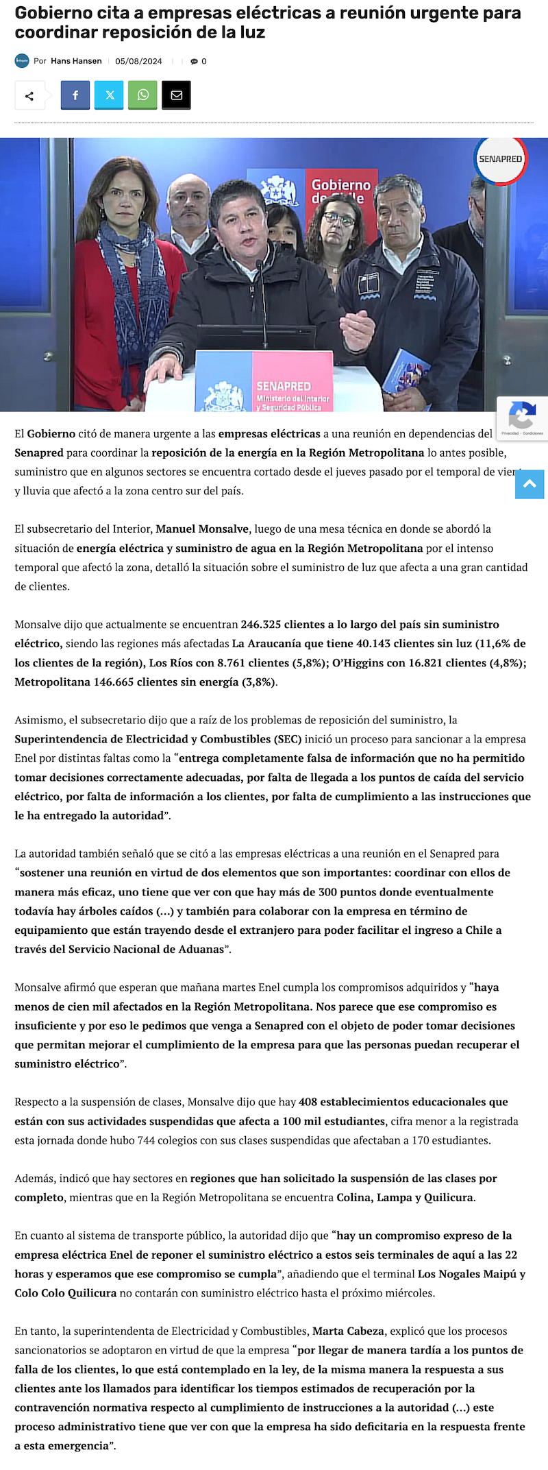 Gobierno anuncia nuevas multas por cortes de luz y prepara cambios a proyecto de subsidios - (El Mercurio de Santiago)