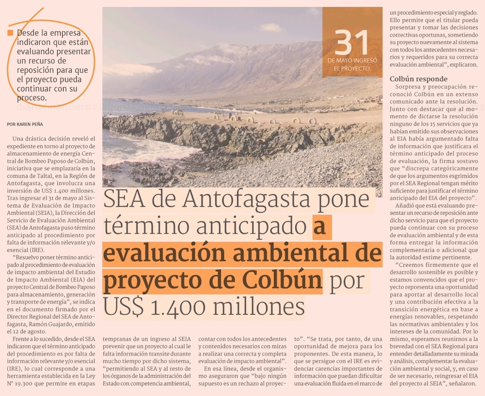 Central Paposo, de Colbún: SEA pone término anticipado a proyecto por US$ 1.400 millones - (El Mercurio de Santiago)