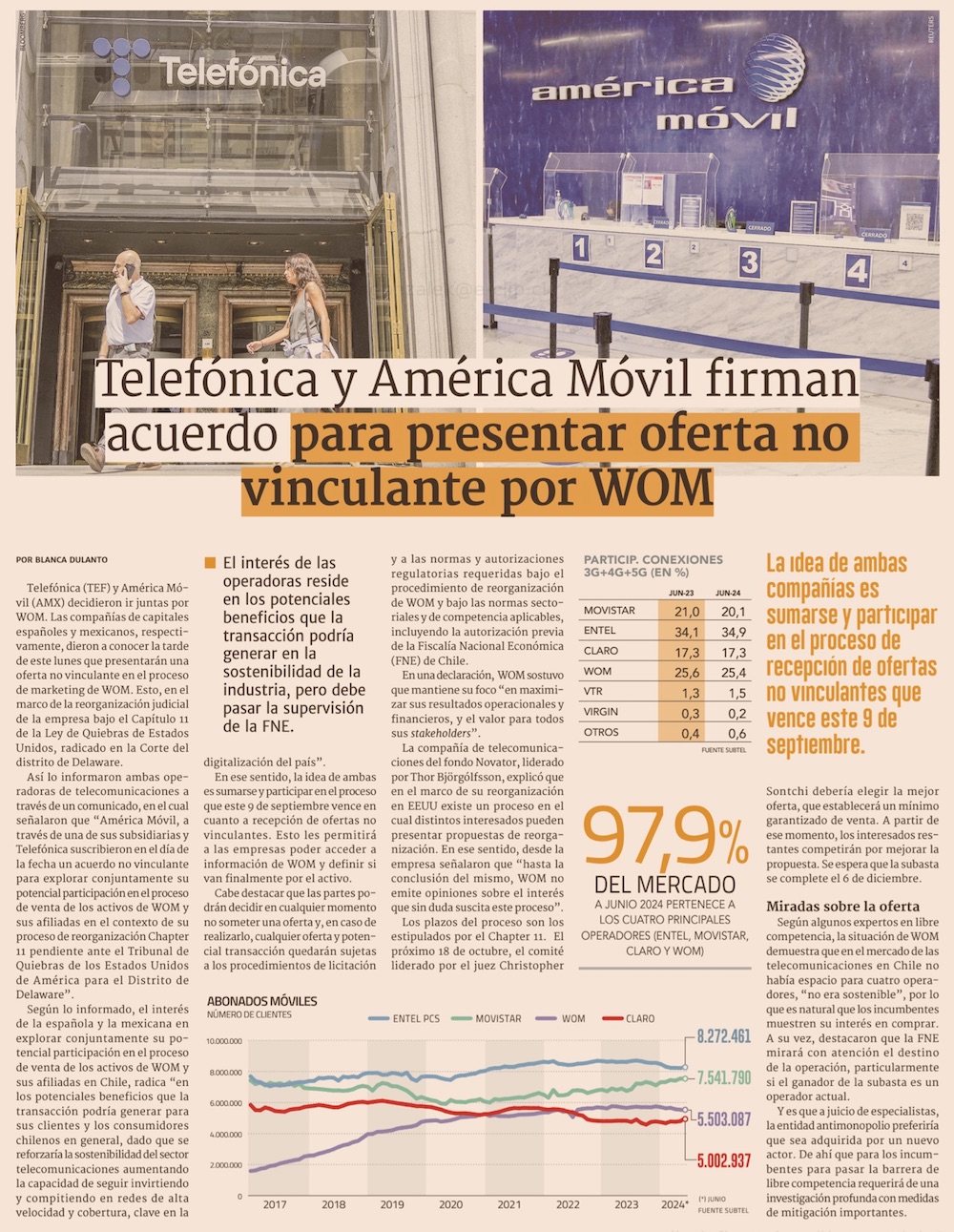 Dueños de Claro y Movistar exploran compra de activos de WOM en el marco de reorganización - (El Mercurio de Santiago)