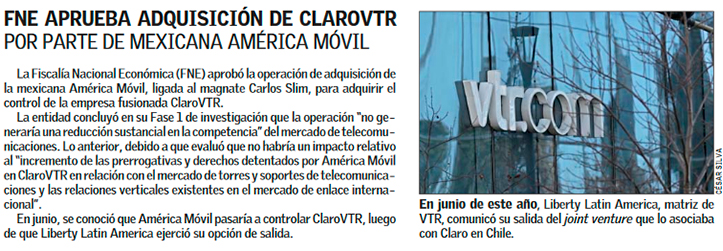 FNE da luz verde a adquisición de ClaroVTR por parte de América Móvil - (Diario Financiero)