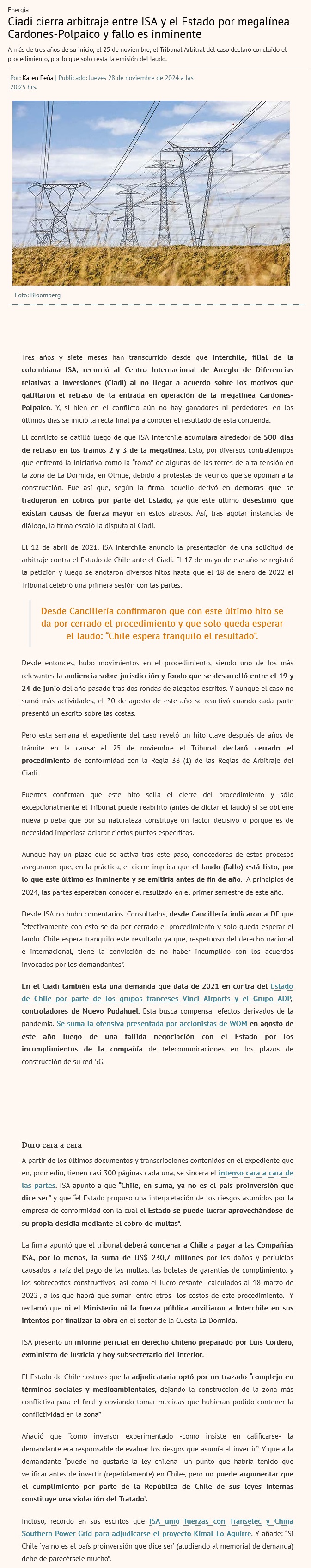 Ciadi cierra arbitraje entre ISA y el Estado por megalínea Cardones-Polpaico y fallo es inminente - (Diario Financiero)