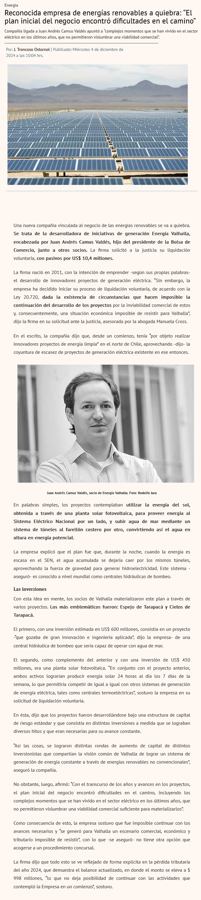 Juan Andrés Camus pone fin al millonario proyecto Valhalla - (La Segunda)